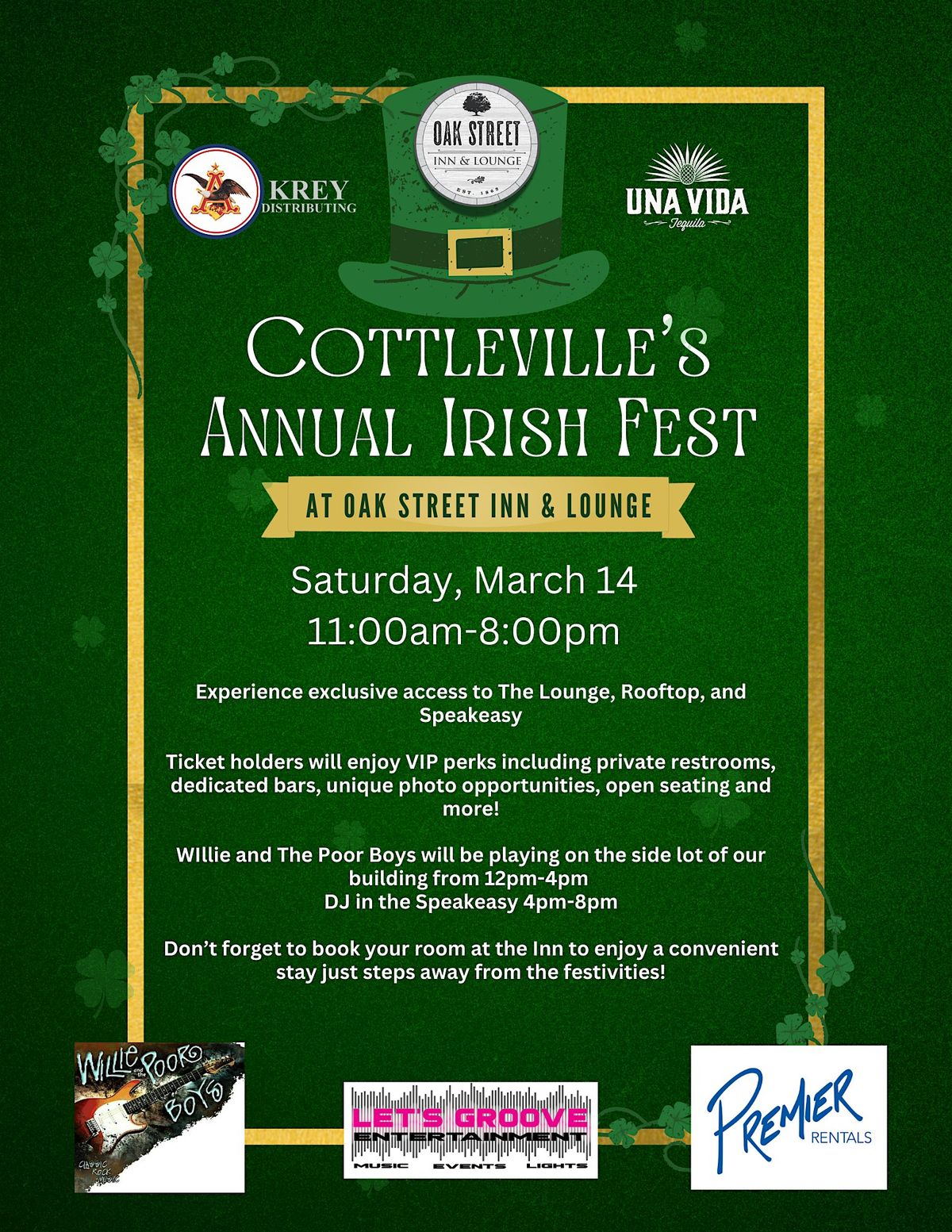 Experience Cottlevilleโs largest St. Patrickโs Day celebration with an Irish Fest VIP wristband, designed for guests looking to enjoy the day with elevated access and comfort. VIP admission includes entry to three Oak Street bars, the Rooftop Patio (weather permitting), the Lounge, and the Speakeasy, along with private restrooms, specialty cocktails, exclusive drink specials and Irish food.