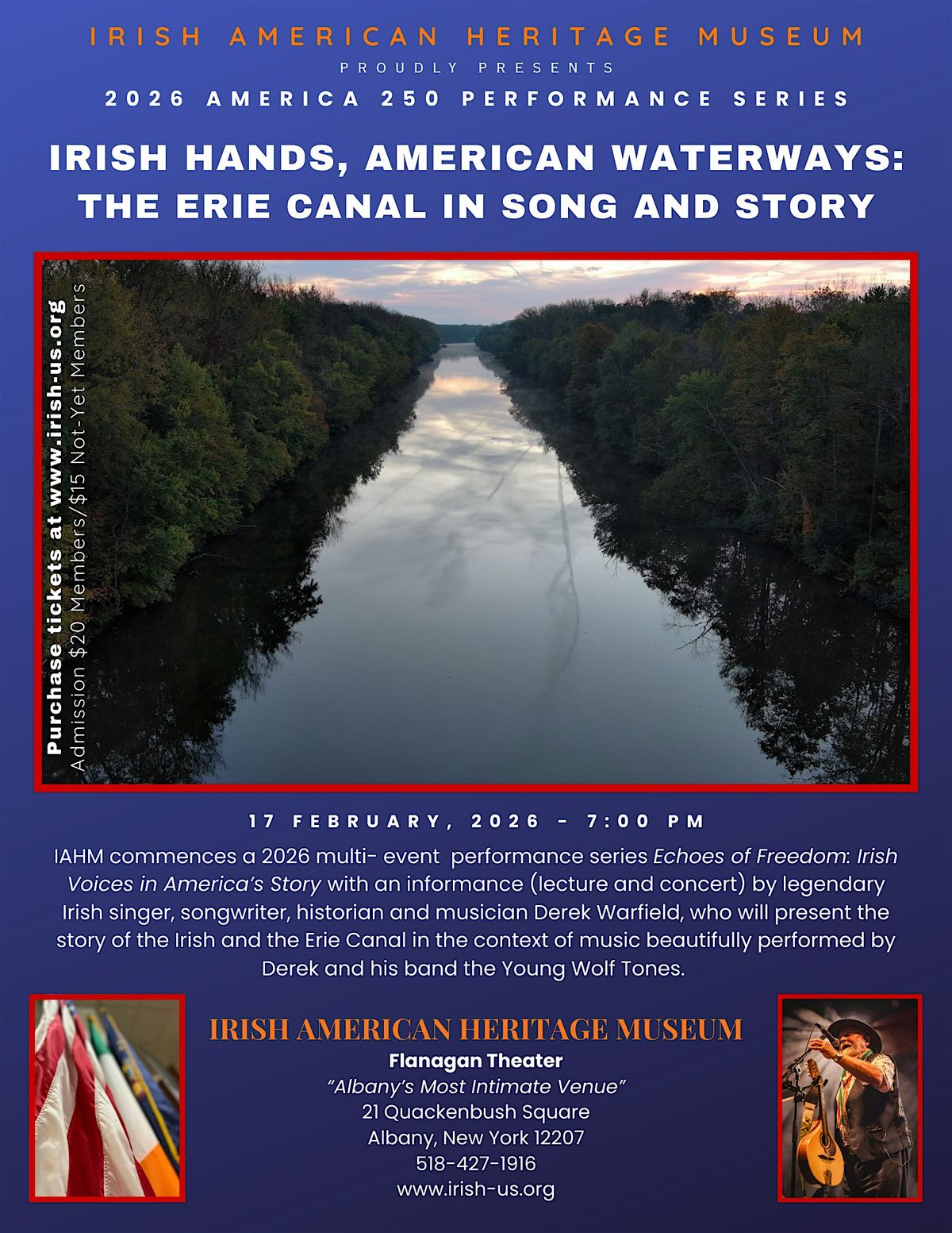 Echoes of Freedom: Irish Voices in America’s Story will commence with the launch of IAHM’s “America 250 Performance Series” on February 17, 2026 (7:00 PM) at the Museum, with an informance (lecture and performance) given by legendary Irish performer Derek Warfield entitled “Irish Hands, American Waterways: The Erie Canal in Song and Story.” Warfield - a founding member of the Irish band the Wolf Tones and globally recognized historian, singer, songwriter, and mandolin player - will both tell the story of the Irish and the Erie Canal and perform songs in this historical context with his band, the Young Wolf Tones.