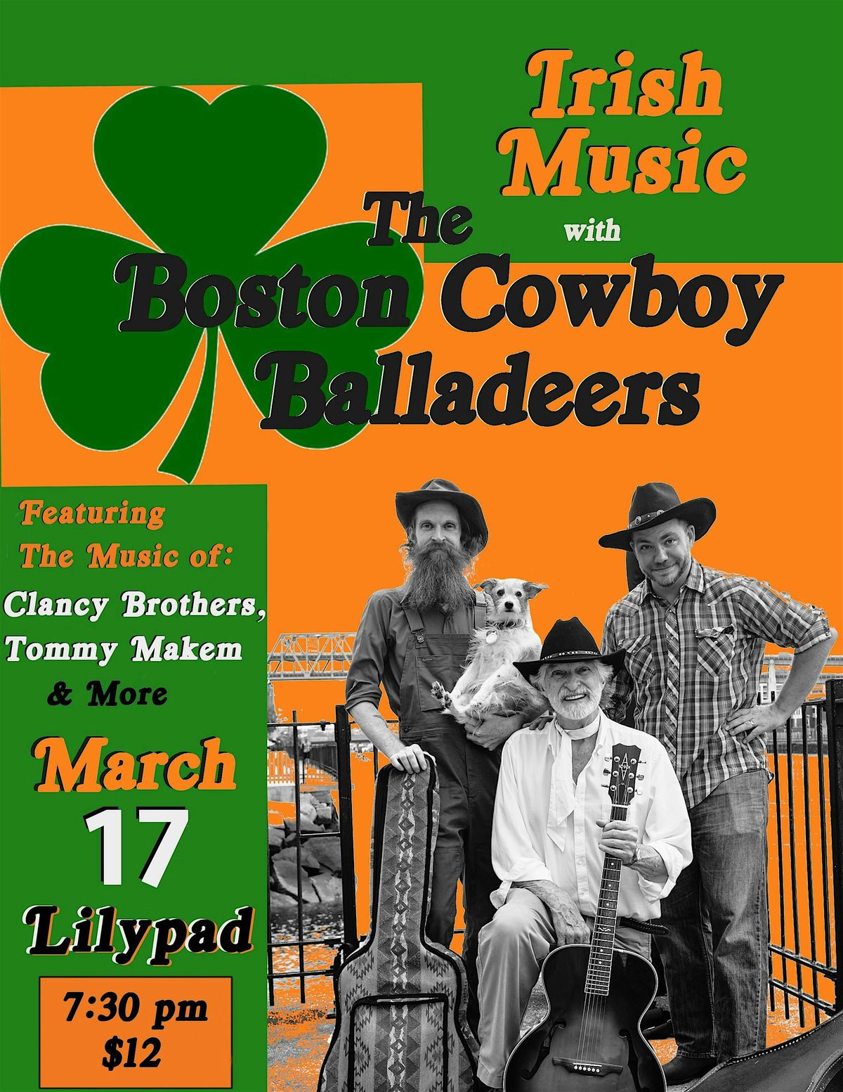 The Boston Cowboy Balladeers bring their classic Irish tunes to the Lilypad on St. Patrick's Day! Grab a drink, sing along, and enjoy a night of old Irish vibes and fantastic melodies. Featuring music by The Clancy Brothers, Tommy Makem, and more...