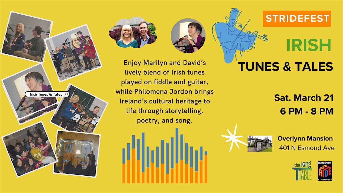 We’ll kick off StrideFest 2026 with Irish Tunes and Tales at Burnaby’s Overlynn Mansion – a heritage home with its own stories to tell. Seasoned StrideFesters will remember local performing arts trio Phillomena Jordan, Marilyn Noort and David Holloway from our popular Celtic Kitchen Party series. Marilyn and Dave will share some soulful and lively Irish tunes on fiddle and guitar, while Philomena delights with stories, poetry, and songs from Ireland’s rich cultural heritage.