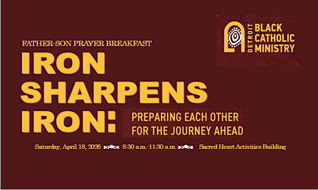 The Detroit Black Catholic Ministry office is hosting a Father-Son Breakfast on Saturday, April 18, 2026, at Sacred Heart Activities Building from 8:30 a.m. to 11:30 a.m. Join us for a morning of breakfast, fellowship, and engaging discussions on topics affecting Black men, Black youth, and the Catholic response. Fathers, sons, mentors, father figures, mentees, and students are warmly invited to attend.