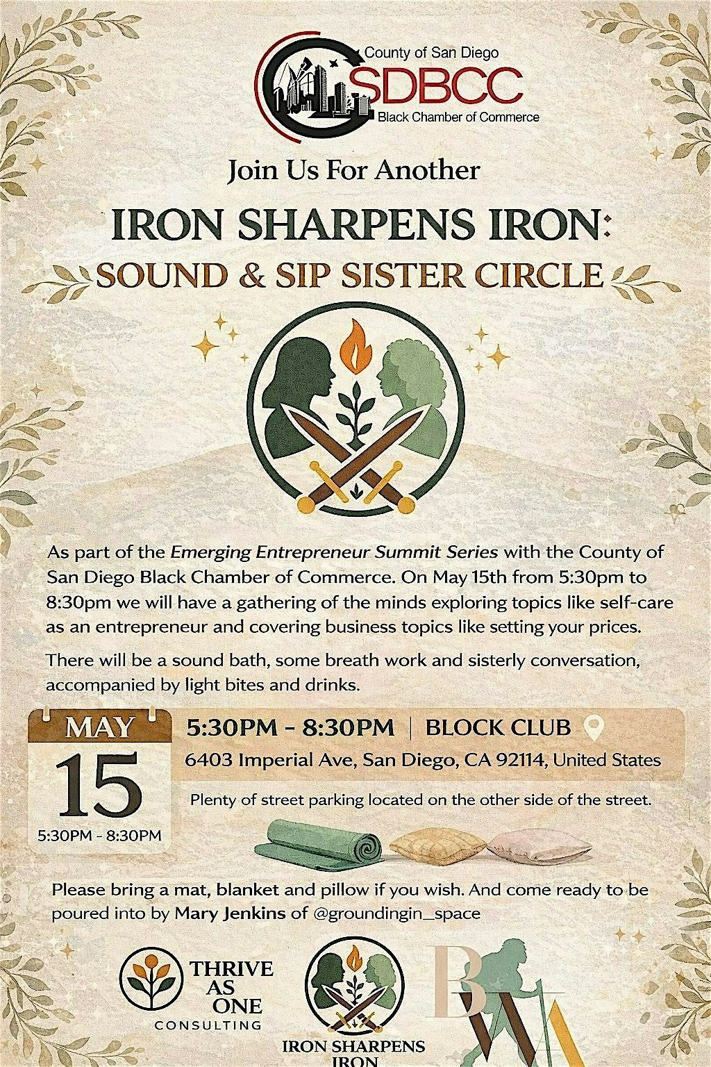 Join us for another Iron Sharpens Iron: Sound & Sip Sister Circle, part of the Emerging Entrepreneur Summit Series in collaboration with the County of San Diego Black Chamber of Commerce 🤝🏾