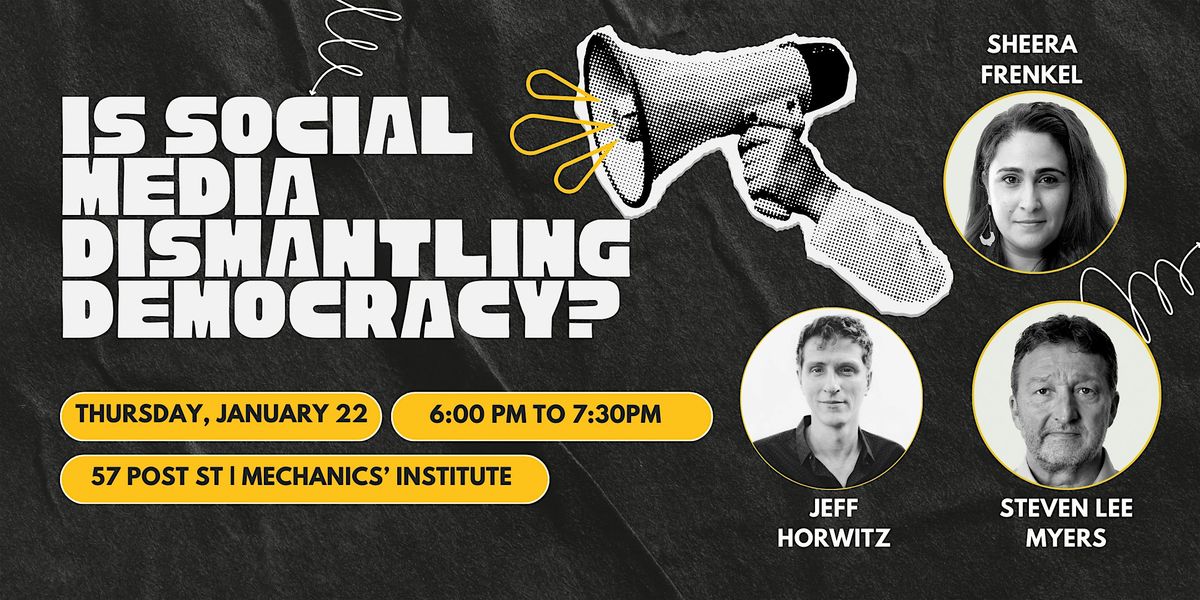 Join reporters Sheera Frenkel, Jeff Horwitz, and Steven Lee Myers in conversation on political messaging and misinformation in the era of social media, and the government’s role in both protecting free speech and regulating online forums.