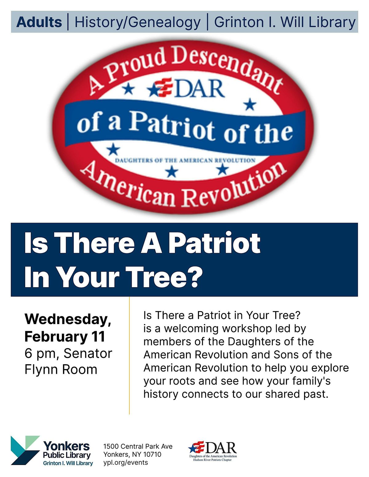 Is There a Patriot in Your Tree? is a welcoming workshop led by members of the Daughters of the American Revolution and Sons of the American Revolution to help you explore your roots and see how your family's history connects to our shared past.