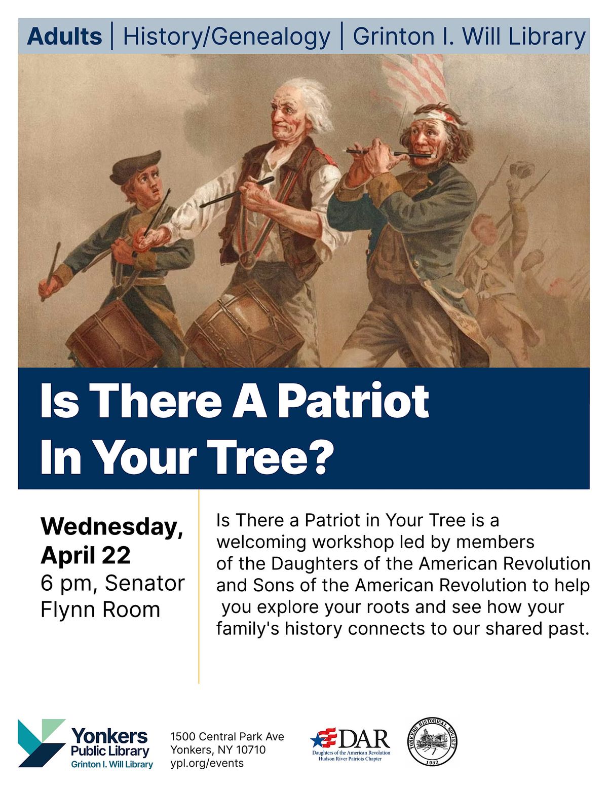 Is There a Patriot in Your Family Tree is a welcoming workshop led by members of the Daughters of the American Revolution and Sons of the American Revolution to help you explore your roots and see how your family's history connects to our shared past.