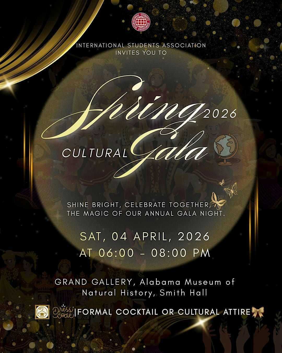 Guests will enjoy an inspiring cultural showcase filled with free food, good music by a talented DJ, and shared stories from around the world. There will also be giveaways. The gala will take place on Saturday, April 4, 2026, from 6:00–8:00 PM at the Grand Gallery in Smith Hall, offering a magical evening to shine bright and celebrate together. Attendees are encouraged to dress in cultural cocktail attire (that is, the attire in your culture considered to be for cocktail/formal occasions) as we come together for a memorable night honoring global cultures and the spirit of unity. ✨🌍🎉