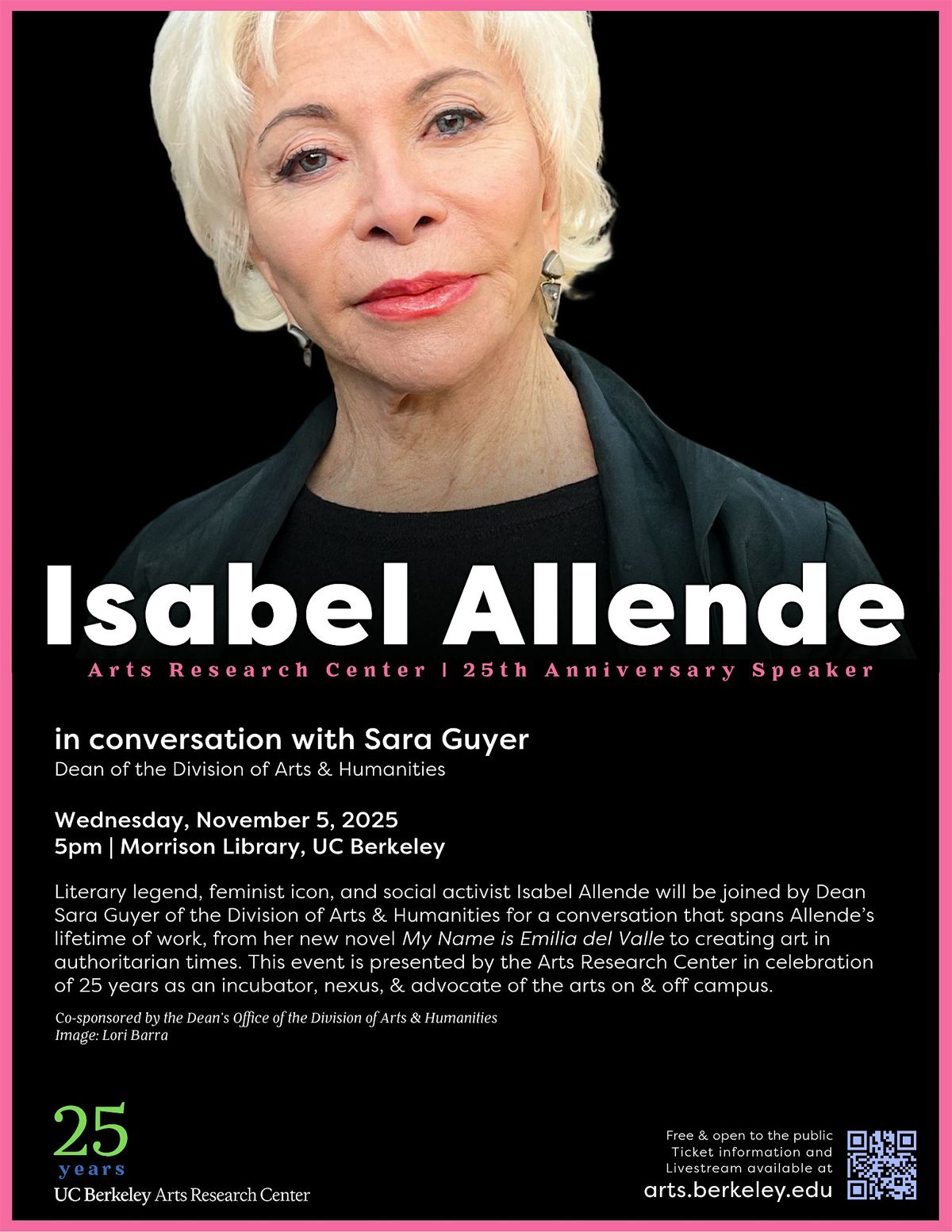 Literary legend, feminist icon, and social activist Isabel Allende will bejoined by Dean Sara Guyer of UC Berkeley's Division of Arts & Humanities for a conversation that spans Allende’s lifetime of work, from her new novel My Name is Emilia del Valle to creating art in authoritarian times. This event is presented by the Arts Research Center in celebration of 25 years as an incubator, nexus, & advocate of the arts on & off campus. More info here.