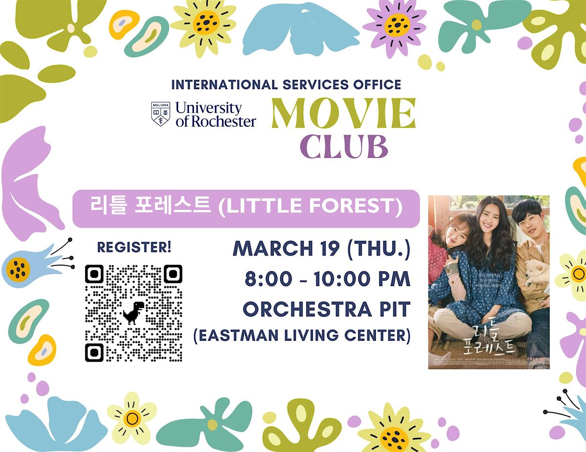 We will begin the movie (Little Forest) at 8:00 PM and end around 9:45 PM. You are welcome to drop by and leave earlier if needed. Light refreshments will be available but please feel free to bring your own food. There are many good restaurants around Eastman Living Center, as well as a dining hall where you can use campus dinning dollars.