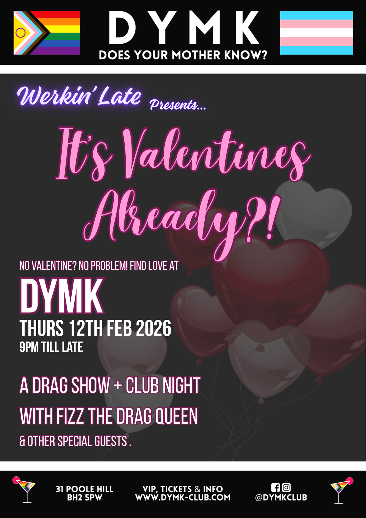 No Valentine? No problem! Join Werkin’ Late on the 12th February 2026 for the wildest, campiest and most unforgettable drag show style club night.Expect fierce drag lipsyncs and performances, starting with the winner of The Big Bournemouth Pride Drag Pageant 2025 Billie Rose @_billie_rose_, followed by our host of the night, the new queen on the scene, FIZZ! @fizzabelleboots