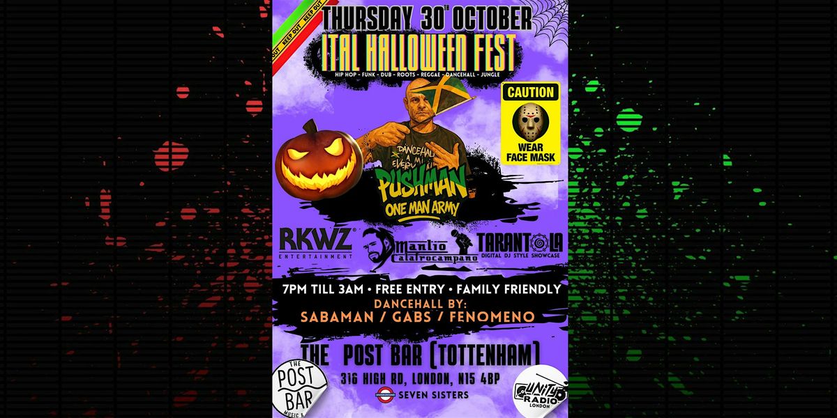 On Thursday 30th October 2025, The Post Bar transforms into a haunted dancehall for the Ital Halloween Fest: a one-of-a-kind celebration bringing together reggae, dub, hip hop, jungle, and drum & bass in true sound system style.