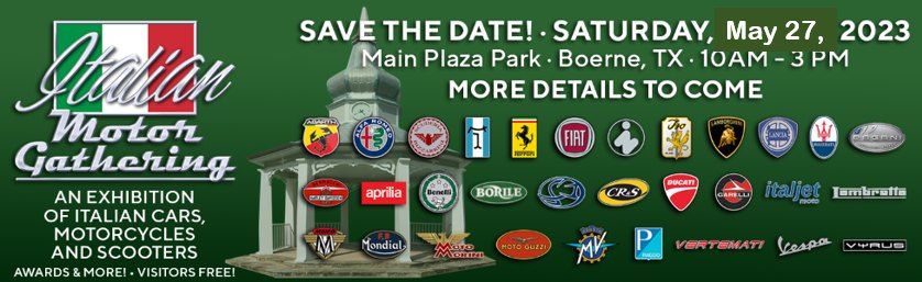Register at https://italianmotorgathering.com/We missed you for 2022 but we are back in 2023. Italian Motor Gathering has earned a reputation as the premier exhibition of the finest Italian motoring in the Texas Hill Country. This event is open to all Italian motoring marques and is free for spectators at the show on Saturday! IMG is grateful for the relationship with City of Boerne and urge you to check out our wonderful sponsors.