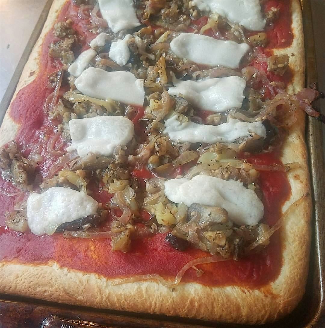 Sicilian style pizza with tempeh sausage (handmade tempeh) and marinara and cashew cheese