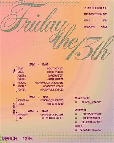 Come hang, get tattooed, discover local artists and food vendors, or make something special at our craft table while your friends get tattooed. Come be part of the day with us!