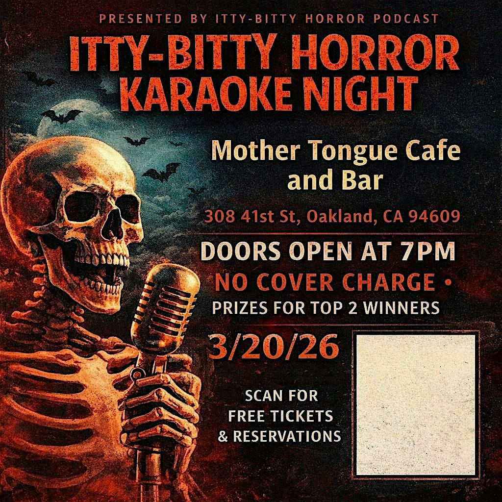 Get ready for a spooky good time at Mother Tongue Cafe & Bar on March 20, 2026 at 7:30 PM (Pacific Time)! Join us for an in-person karaoke night inspired by the Itty Bitty Horror Podcast. Whether you’re a horror fan or just love to sing, this chill evening is perfect for letting loose and having fun. Bring your friends, pick your favorite creepy tunes, and get ready to rock the mic! We'll have rounds like 'Sing Like a Final Girl/Boy', 'Songs to Play at My Funeral', and more!