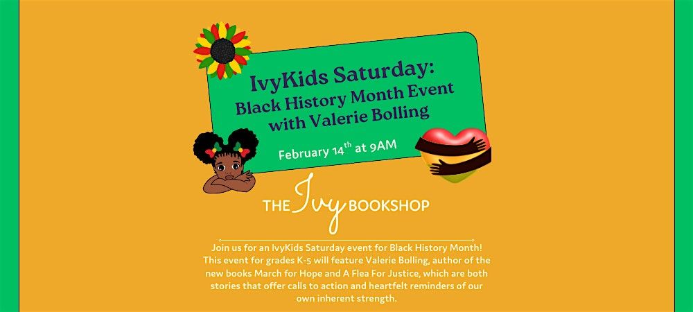 Join us for an IvyKids Saturday event for Black History Month! This event for grades K-5 will feature Valerie Bolling, author of the new books March for Hope and A Flea For Justice, which are both stories that offer calls to action and heartfelt reminders of our own inherent strength.