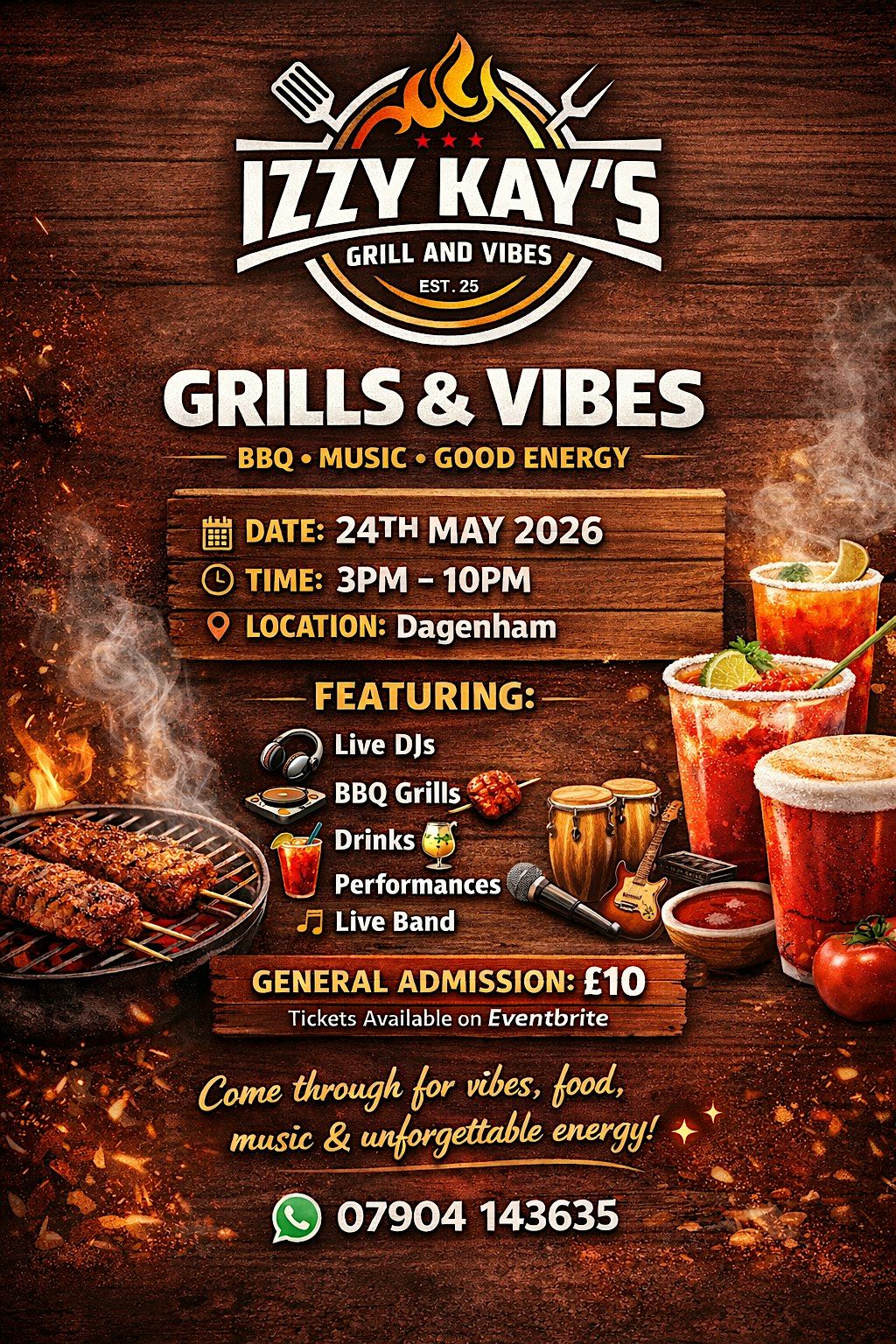 Get ready for a chill day at Izzy Kay's Grills & Vibes! This in-person hangout is all about tasty bites and cool tunes. Bring your crew, enjoy some sizzling grills, and soak up the good vibes. Whether you're here to eat, vibe, or just kick back, it's the perfect spot to unwind and have fun. Don’t miss out on this awesome experience!