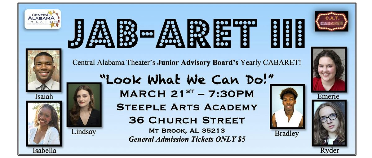 On March 21st, 2026, Central Alabama Theater's JUNIOR ADVISORY BOARD is proud to present the third annual CAT JABaret!