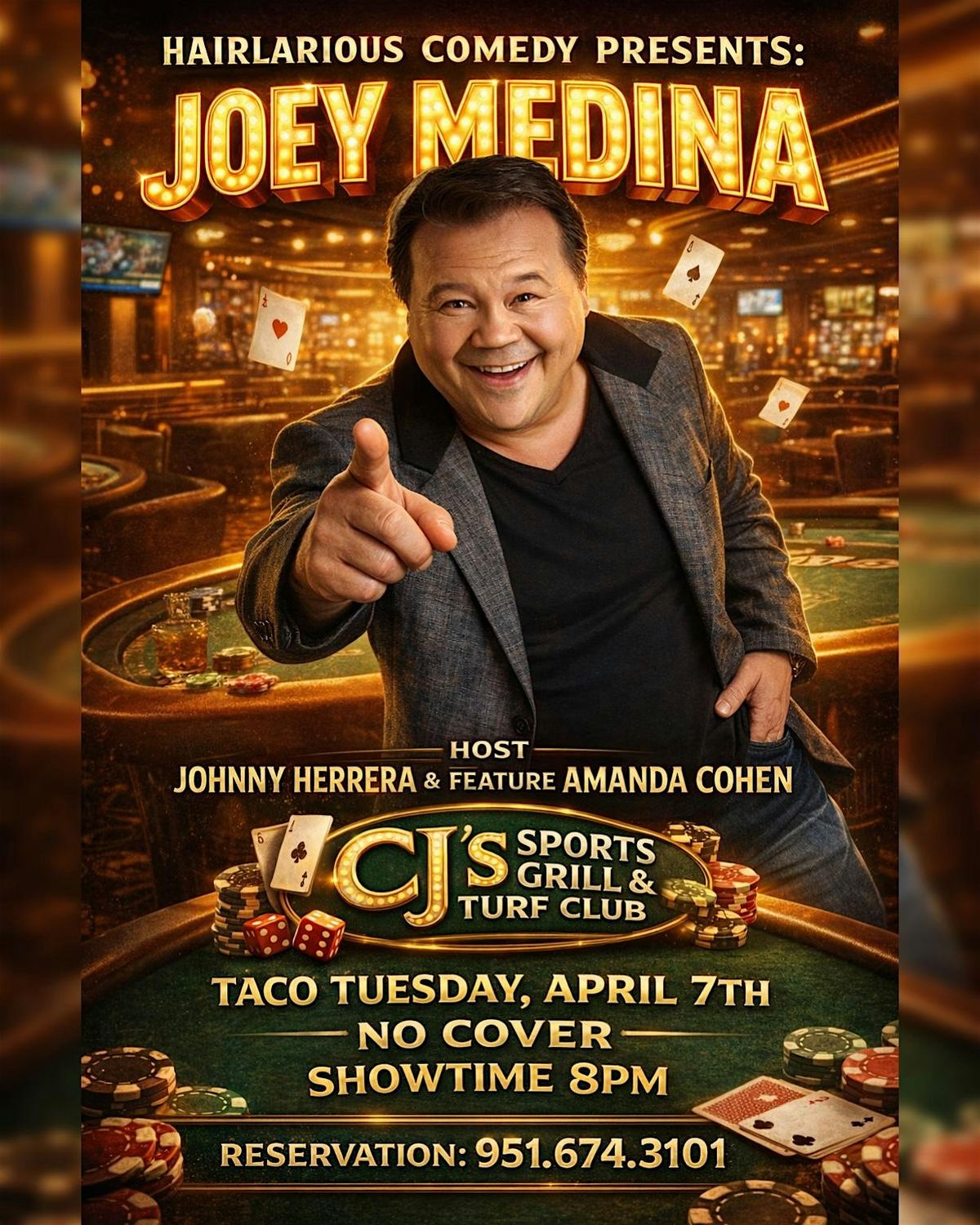 Mark your calendar for Tuesday, April 7th at 8PM and meet us at CJโs Sports Grill & Turf Club (inside the Lake Elsinore Casino ๐ฐ) for another unforgettable HAIRlarious Comedy Night ๐๐ค