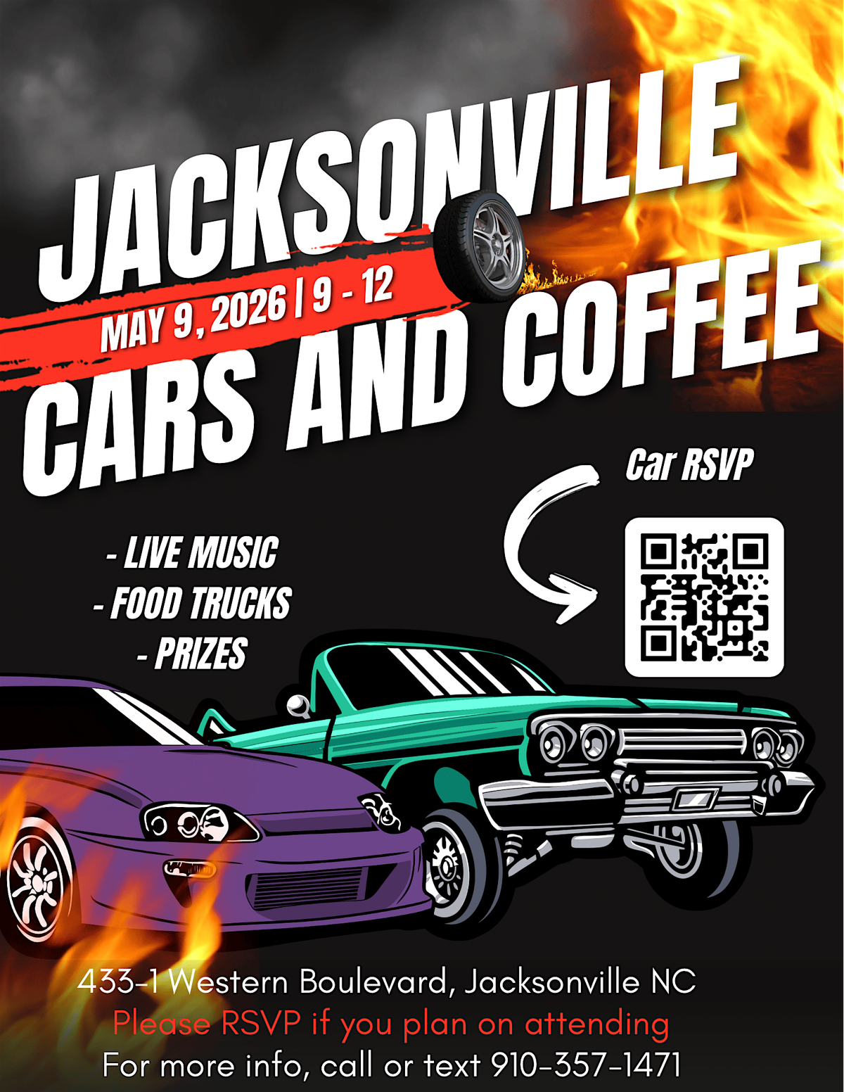 Cars & Coffee – May 9th, 9AM–12PM at 433‑1 Western Blvd, Jax NC! Live music, vendors & prizes! Info: 910‑357‑1471