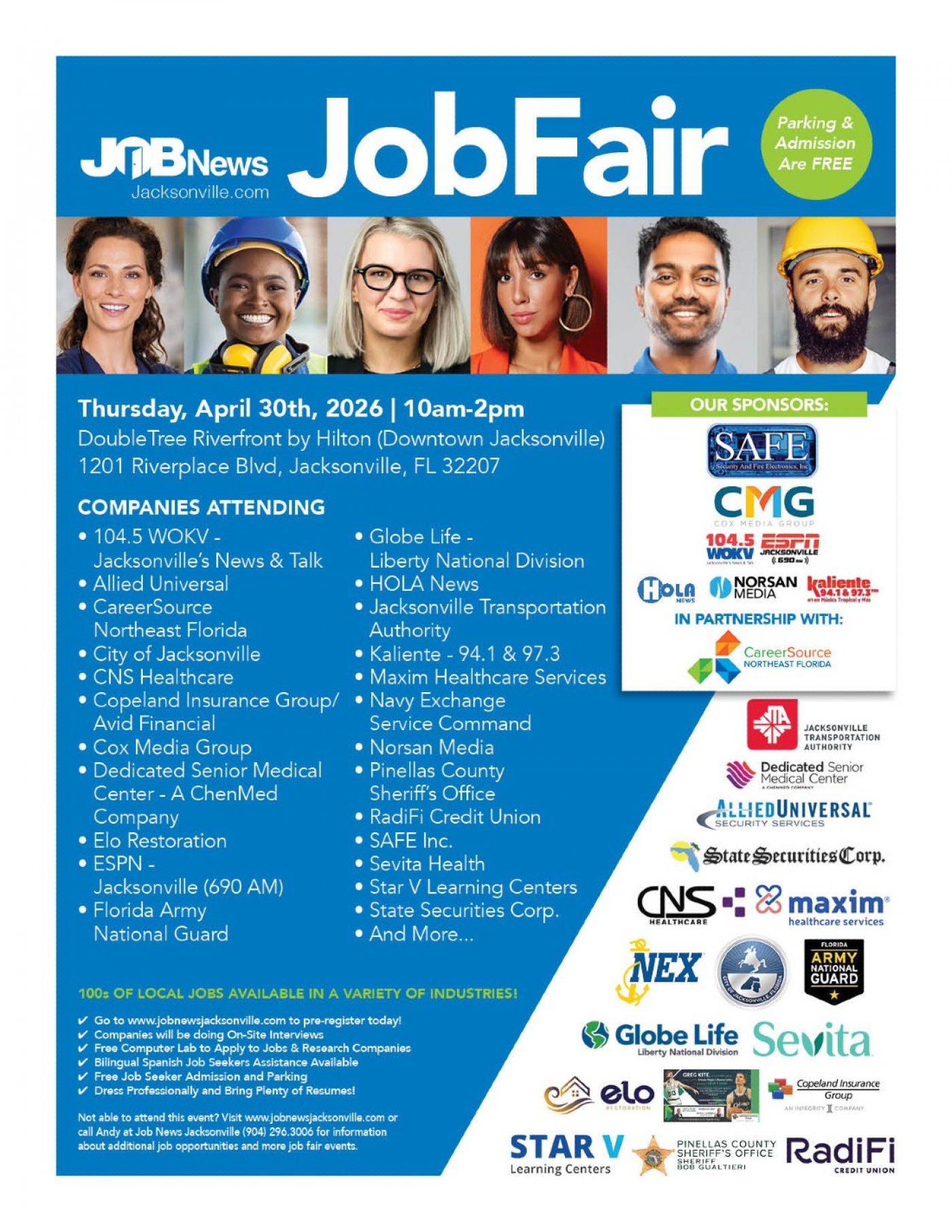 Job News Jacksonville, along with our Sponsors - SAFE (Security and Fire Electronics, Inc.), Cox Media Group and Norsan Media / Hola News / Kaliente - 94.1 & 97.3 FM and In Partnership with CareerSource Northeast Florida, will be hosting a Hiring Event from 10 am to 2 pm on Thursday April 30th at The DoubleTree Riverfront Hotel located at 1201 Riverplace Blvd in Downtown Jacksonville.