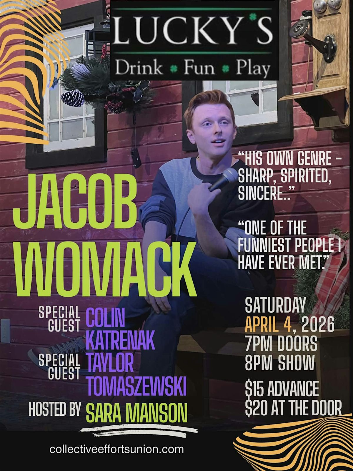 Jacob Womack Comedy @ LUCKYS CLUB 224 w/ Colin Katrenak, Taylor Tomaszewski, & Sara MansonAbout this Event