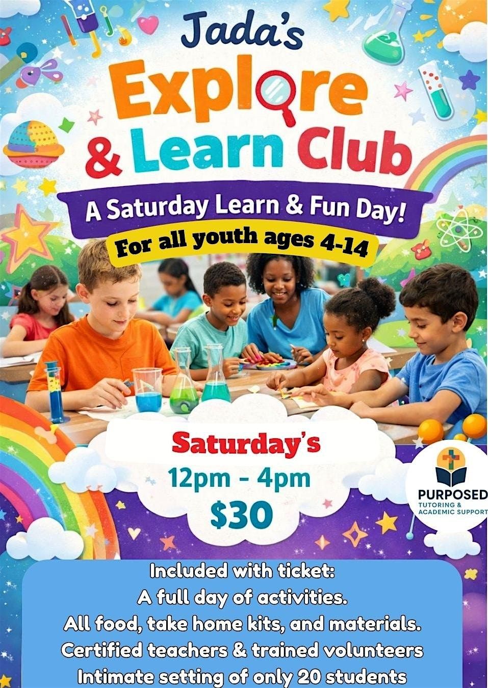 Join us for Jada’s Explore & Learn Club, a one-day experience filled with hands-on learning, creativity, and excitement for kids ages 4–14!