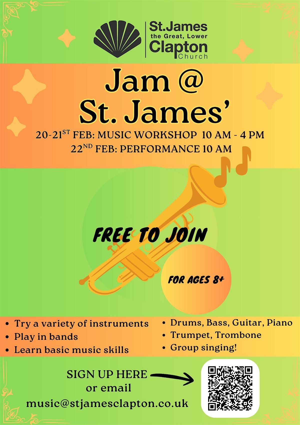 Welcome music lovers! πΆ Join us for JAM @ St James Music Workshop at St James the Great Church on April 04th 2026 at 10:30 AM (Europe/London Time). Let's come together to share our passion for music and learn from each other. Whether you're a beginner or a pro, this workshop is for everyone. Don't miss out on this opportunity to connect with fellow musicians and have a great time. Musical Instruments provided. See you there!