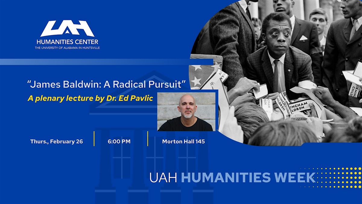 A plenary lecture by Dr. Ed Pavlic, "James Baldwin: A Radical Pursuit," will be held on Thursday February 26 at 6:00pm in Morton Hall room 145. This will culminate UAH Humanities Week events. Dr. Pavlic is Distinguished Research Professor of English, African-American Studies, and Creative Writing at the University of Georgia and one of the world's foremost experts on the American writer James Baldwin and consulted on Barry Jenkins' 2018 film If Beale Street Could Talk, an adaptation of Baldwin's novel. Dr. Pavlic's talk will examine Baldwin's trips to the Deep South in the 1950s and 1960s.
