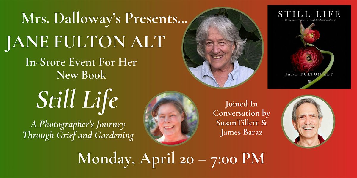 Join us at Mrs. Dalloway's Bookstore on Monday, April 20 when Jane Fulton Alt comes to the store to share her new book Still Life: A Photographer's Journey Through Grief and Gardening. Jane will be joined in conversation by Susan Page Tillett and James Baraz and will sign copies of her book after the presentation.