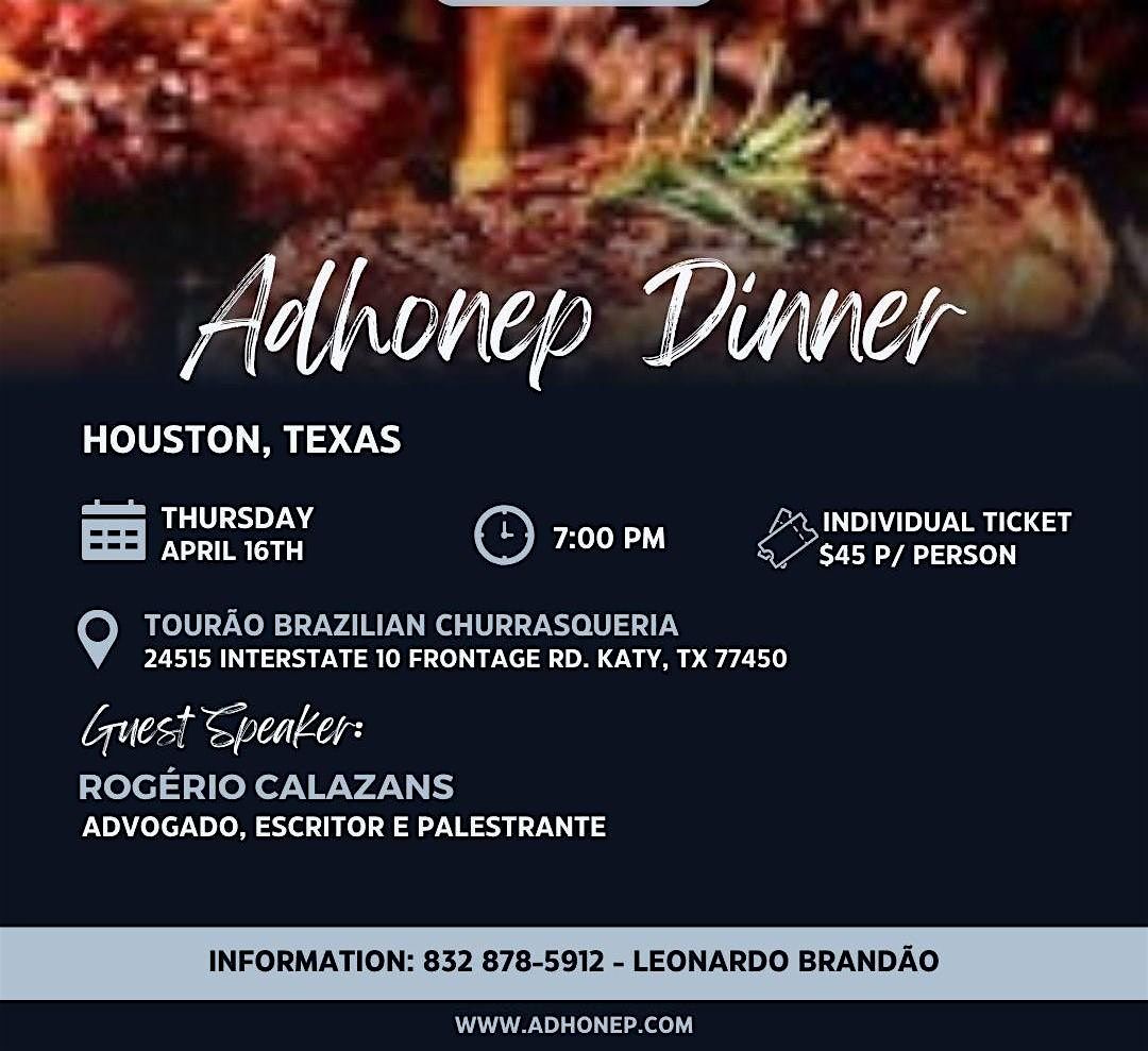 Venha participar de mais um Jantar de networking da Adhonep Houston. Nós somos a maior associação de homens e mulheres de negócio do mundo. Além de um networking de alto nível, teremos o Dr. Rogério Calazans (advogado, escritor e palestrate internacional), vindo diretamento do Brasil para palestrar no evento. Ele estará compartilhando sua tragetória de vida até alcançar o sucesso profissional e nos negócios.