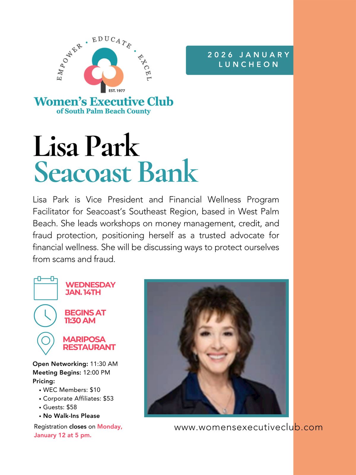 Ring in the New Year with the Ladies of WEC at our new venue Mariposa's - 2nd floor of Neiman Marcus at Boca Town Center Mall. Enter throught the parking entrance. Turn right and take the elevator to the 2nd floor. Exit right and Mariposa is at the end of the hall