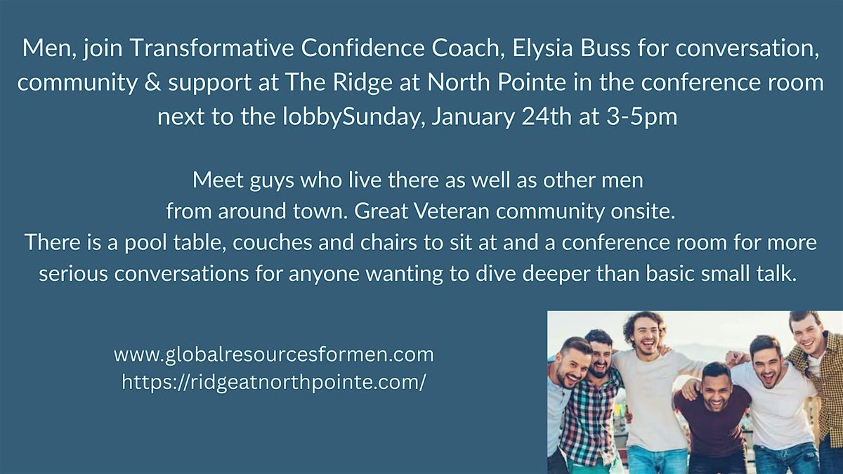 Join Elysia Buss, Transformative Confidence Coach, for a men-only meetup at The Ridge at North Pointe, hosted in the private conference room next to the lobby.