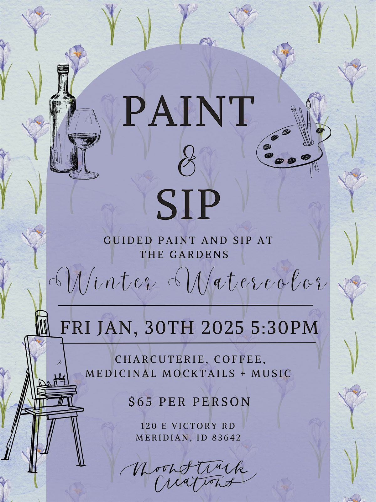 Watercolor Workshops and Paint and Sip events are perfect for family outings, getting together with friends, or a fun way to mix up date night! Moonstruck Creations events can be found all around the Treasure Valley in Boise, Meridian, Garden City, Nampa, Caldwell, Kuna, Eagle, Star, Middleton, Emmet, Avimor, Donnelley, and McCall. Moonstruck Creations events are a safe place to be creative and embrace our own unique expression.