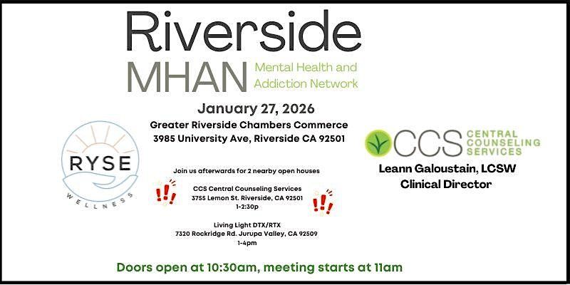 Join us in person for the January Riverside MHAN Mental Health and Addiction Network! This is your chance to connect, learn, and share with others passionate about mental health and addiction recovery treatment. If you are a professional in the behavioral health space, come hang out and be part of the community making a difference. Don’t miss out on great conversations and real connections!