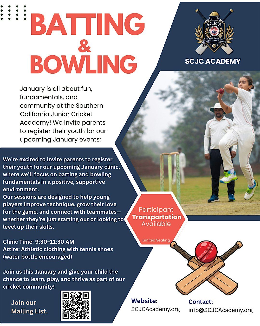 By registering for this event, you grant the Southern California Junior Cricket Academy permission to photograph and/or record video of participants during the clinic. These images and videos may be used for promotional, educational, and marketing purposes, including on social media, websites, and other academy materials.