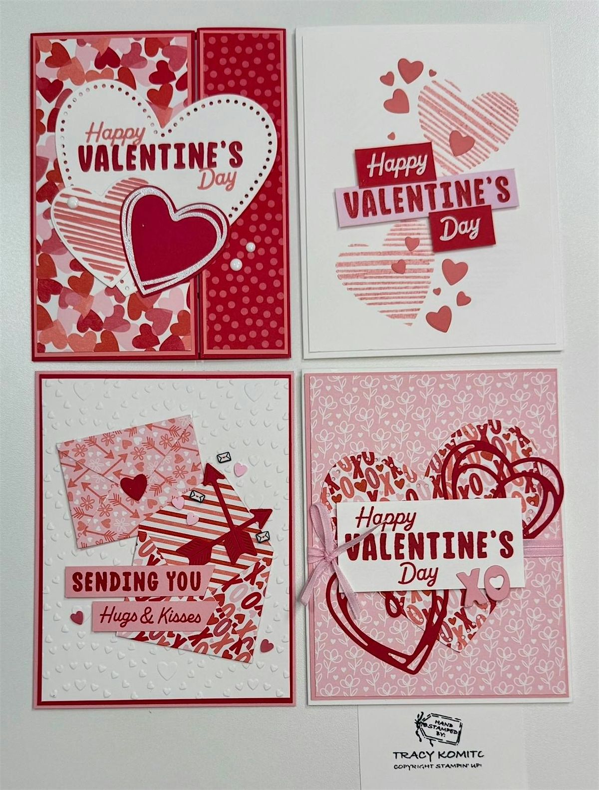 Join us for my monthly card making class and make 8 Valentine's cards (2 of each shown). As part of the class, you'll receive a full package of 12x12 designer paper, a full embellishment package and all of the precut supplies to make all 8 cards.