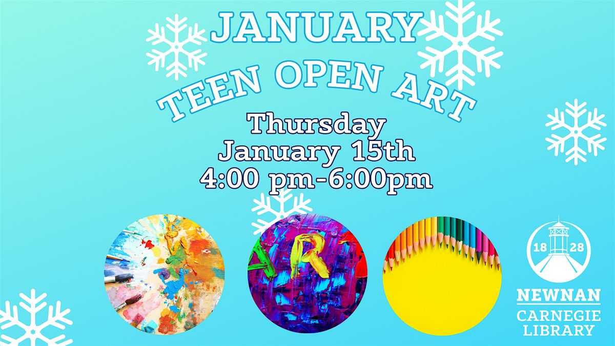 Teen Open Art! Ages 11-18. Come join us at the Newnan Carnegie Library for January's Teen Open Art. All supplies provided.