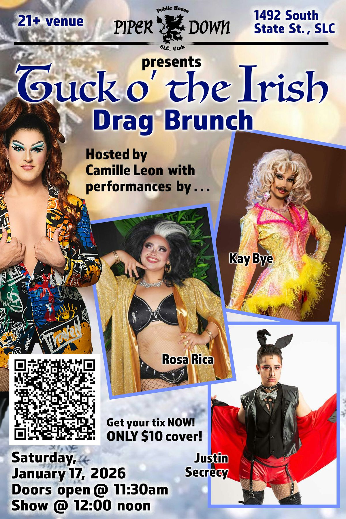 Grab some friends and come to The Tuck of the Irish Drag Brunch at Piper Down Pub!! Join us for a memorable experience in December with delicious food and drinks, while laughing and enjoying amazing performances by the most talented drag and burlesque performers in SLC. Piper Down Pub and the host, Camille Leon, will serve you a one-of-a-kind experience! Grab your friends and family and come join the fun at Piper Down Pub! Our monthly drag brunch will be hosted by the charismatic Camille Leon, with dynamic performances featuring a lineup of the next generation of talent in Salt Lake City featuring Justin Secrecy, Kay Bye, and Rosa Rica!