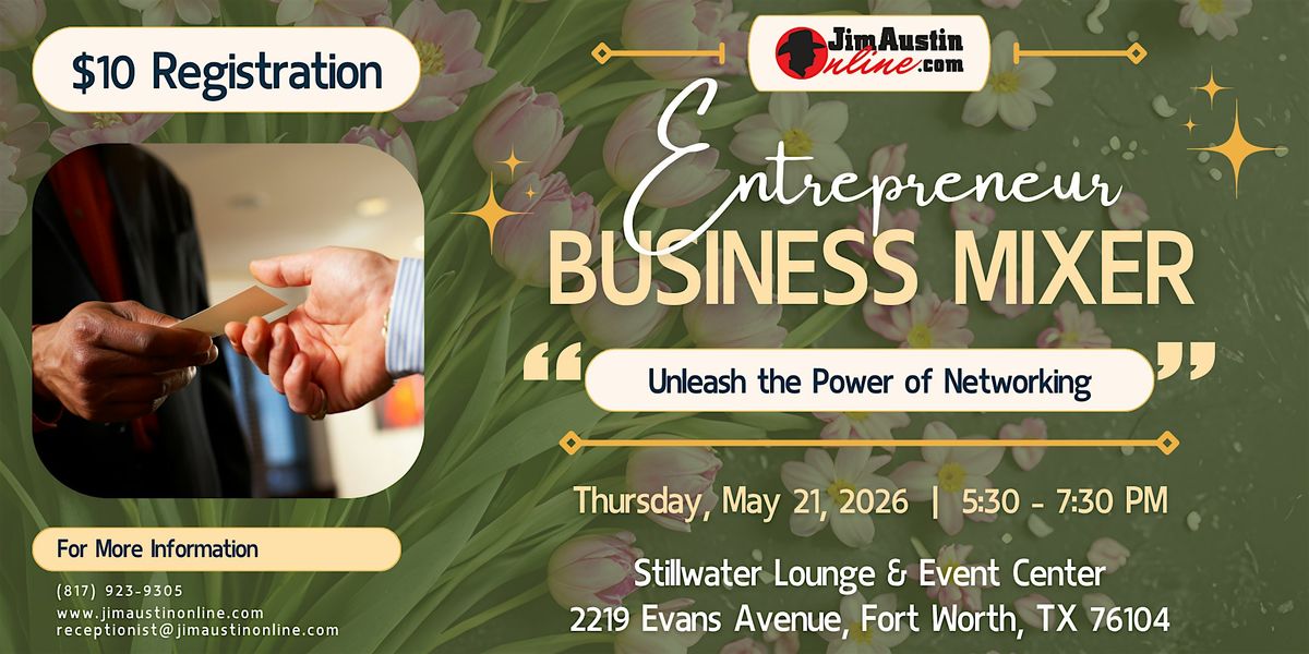 Welcome to the Entrepreneur Business Mixer! Join us for an evening of networking, collaboration, and fun at the Stillwater Lounge & Event Center. Connect with fellow entrepreneurs, share ideas, and build valuable relationships. Whether you're a seasoned business owner or just starting, this event is the perfect opportunity to expand your network and grow your business. Don't miss out on this fantastic chance to mingle with like-minded individuals and take your business to the next level.