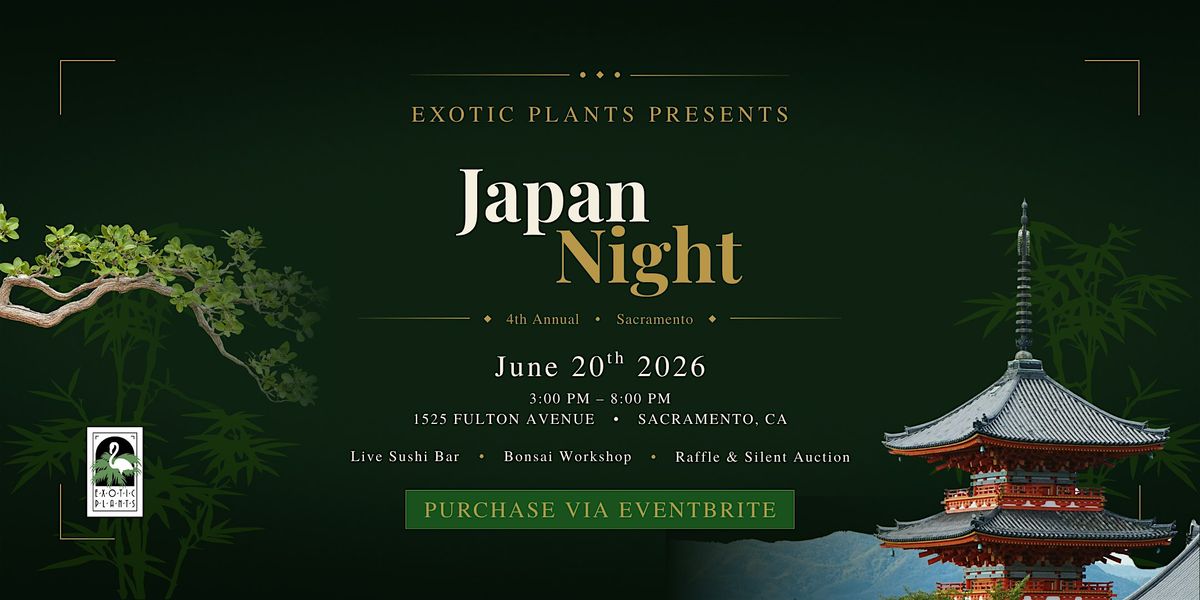 Join us for our most anticipated event of the year — an immersive evening of Japanese culture, cuisine, and craftsmanship, held inside the lush ambiance of the Exotic Plants showroom in Sacramento's Pocket neighborhood.