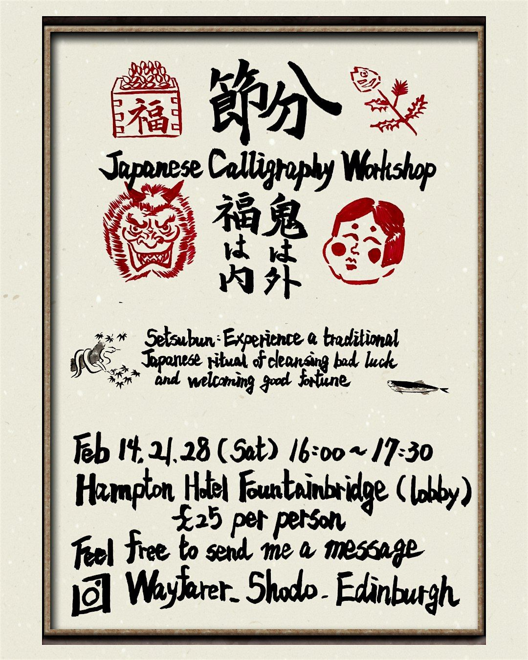This is our February workshop, which is Setsubun. Setsubun is tradition Japanese fortune tradition to shake off evil and invite fortune into your house. We're going to craft Denden daiko and write calligraphy. If you are interested in this workshop then please feel free to join!