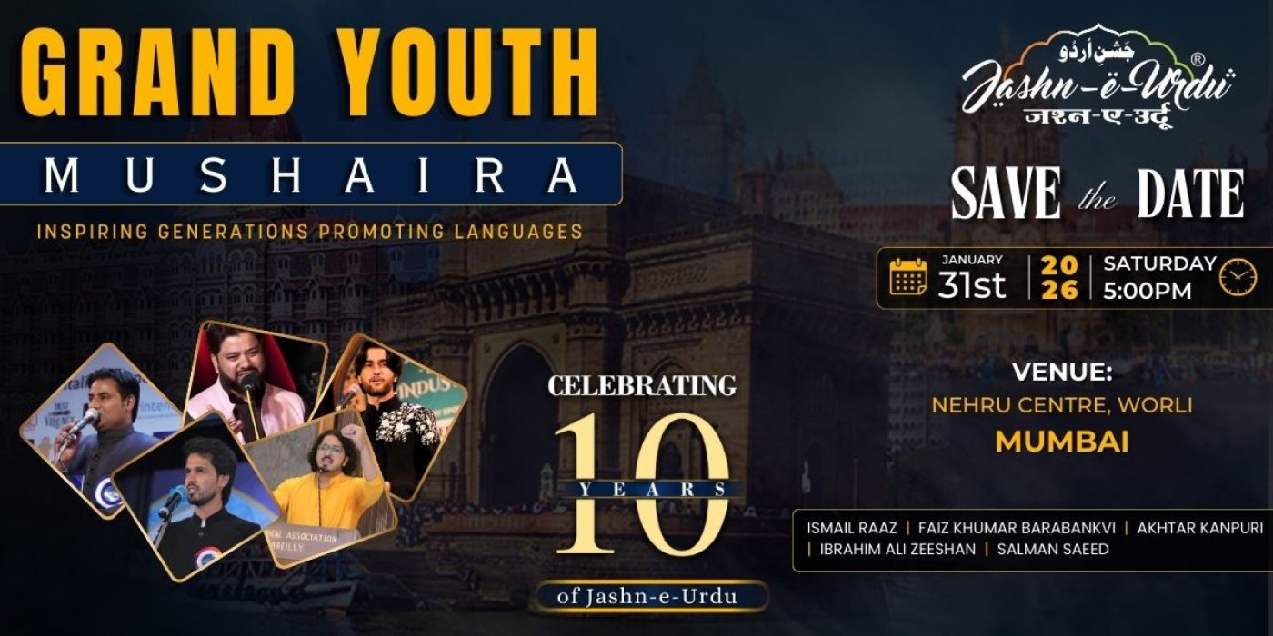 Join us for Jashn-e-Urdu Grand Youth Mushaira, an evening dedicated to the energy of youth the beauty of verse and the enduring legacy of Urdu. Mark your calendars gather your friends and experience the poetic renaissance in the cultural heart of Mumbai.