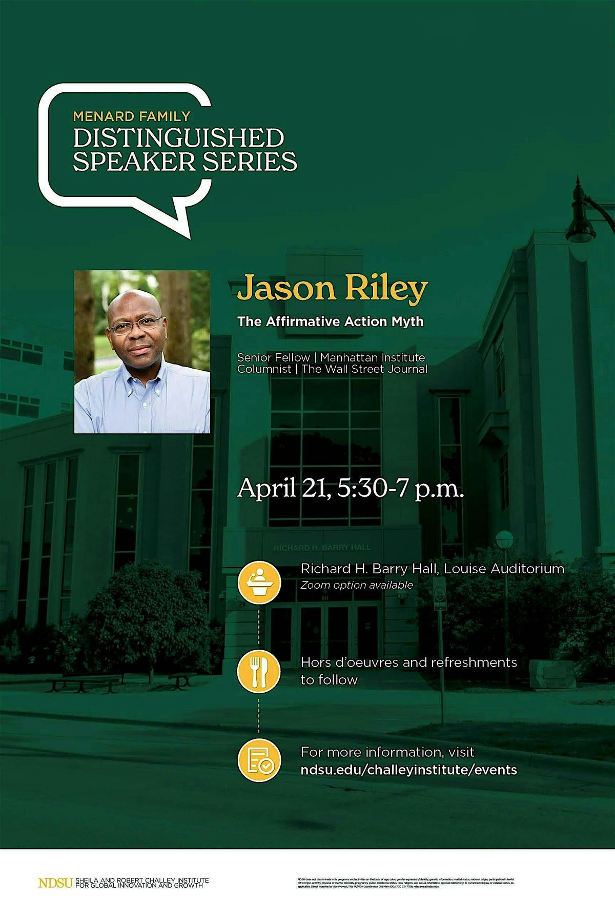 Mr. Jason Riley will speak in the NDSU Barry Hall, Louise Auditorium. All are invited to join us for the conversation with him at 5:30 p.m., followed by a reception with hors d'oeuvres and refreshments at 7:00 p.m. Parking is available in the visitor parking lots (), and these lots are free to use after 4:30 p.m.