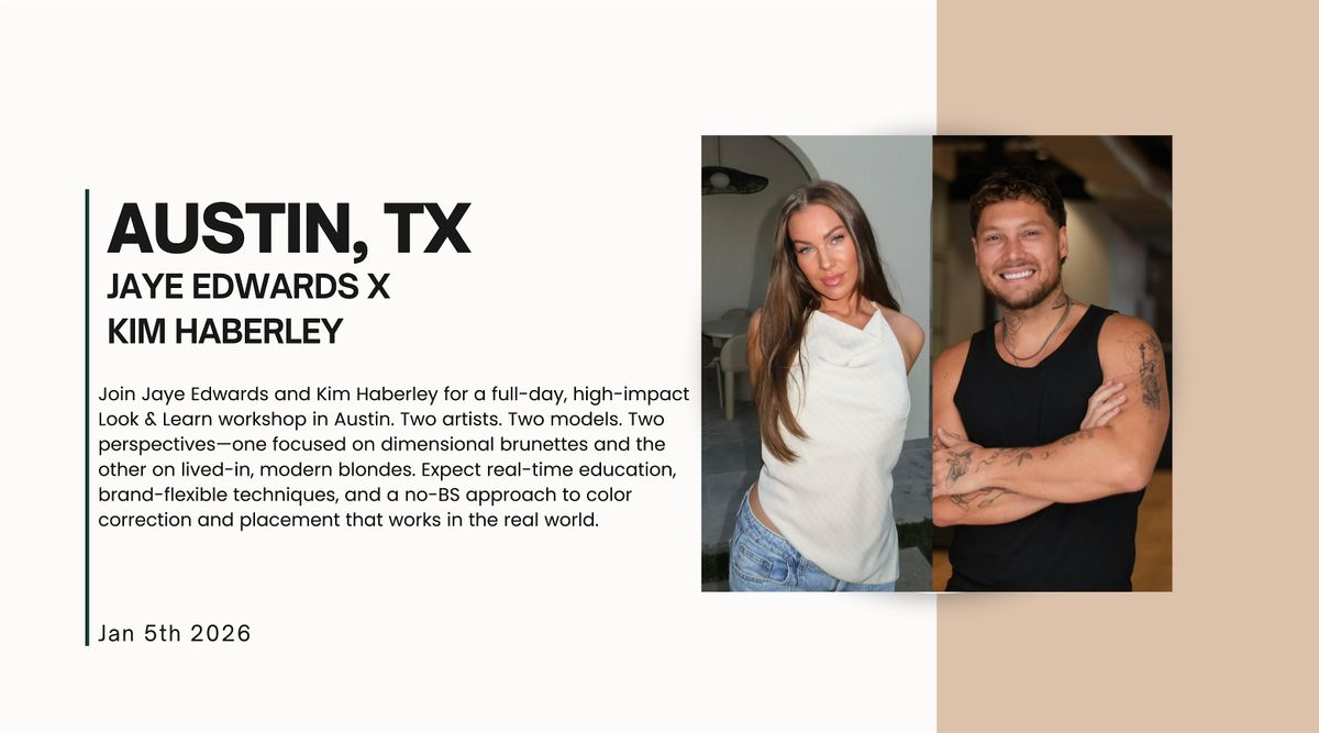 Join Jaye Edwards and Kim Haberley for a full-day, high-impact Look & Learn workshop in Austin. Two artists. Two models. Two perspectives—one focused on dimensional brunettes and the other on lived-in, modern blondes. Expect real-time education, brand-flexible techniques, and a no-BS approach to color correction and placement that works in the real world.