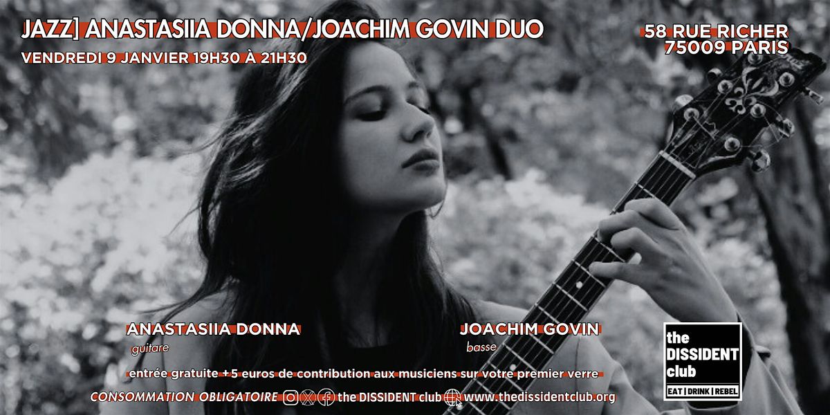 Rejoignez-nous pour un moment de jazz intimiste avec Anastasiia Donna à la guitare et Joachim Govin à la basse, revisitant des standards intemporels du jazz aux côtés de compositions originales. Un dialogue subtil et élégant entre les cordes, mêlant groove, mélodie et improvisation dans une atmosphère chaleureuse et enveloppante.