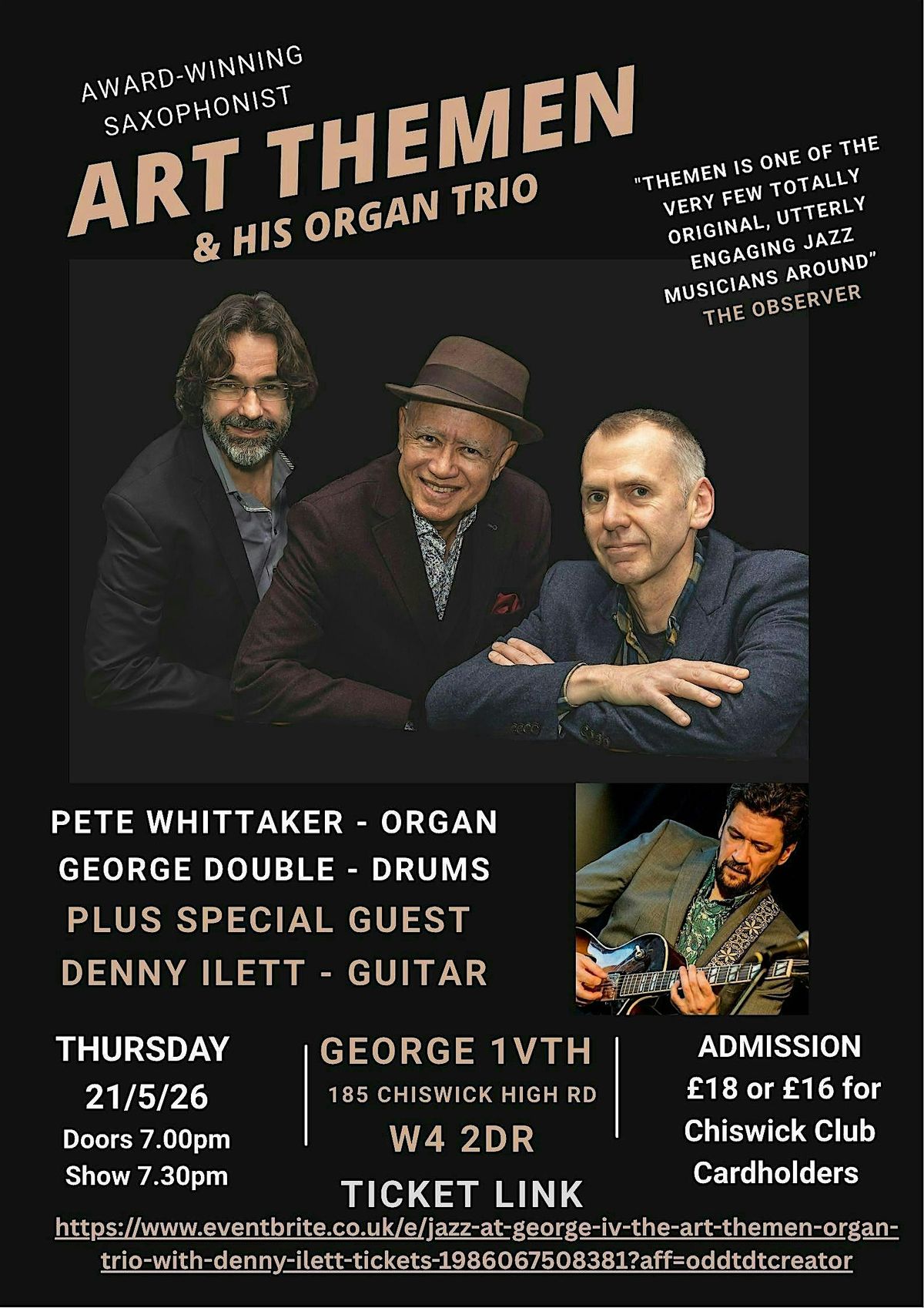 Featuring the legendary, award winning saxophonist Art Themen “One of the very few totally original utterly engaging jazz musicians around….” – Dave Gelly, The Observer, with his regular working organ trio with the stellar organist Pete Whittaker and the formidable George Double on drums.