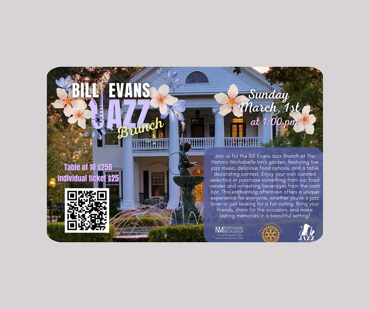 Bill Evans Jazz Brunch Hosted by The Hammond Rotary club is on Sunday March 1st 2026 at Historic Michabelle Inn. This event is a fundraiser for Hammond Rotary Club's Scholarship fund and the Southeastern Music Department.