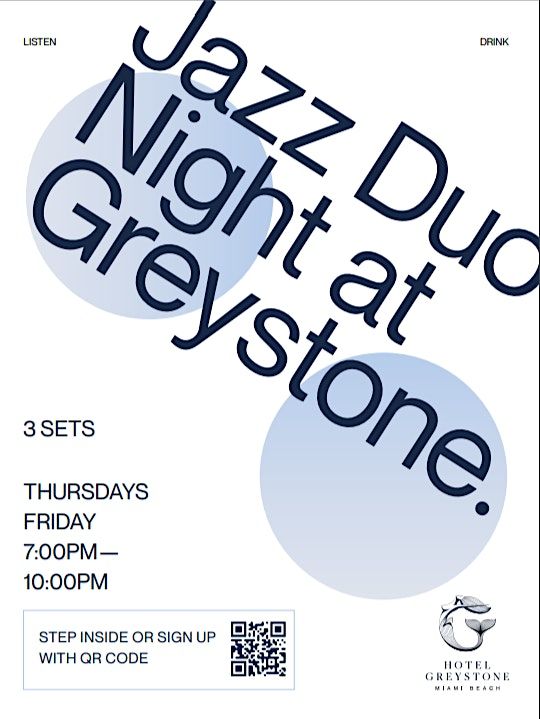Enjoy three sets of spectacular jazz music every Thursday and Friday from 7PM-10PM at the art deco Hotel Greystone.