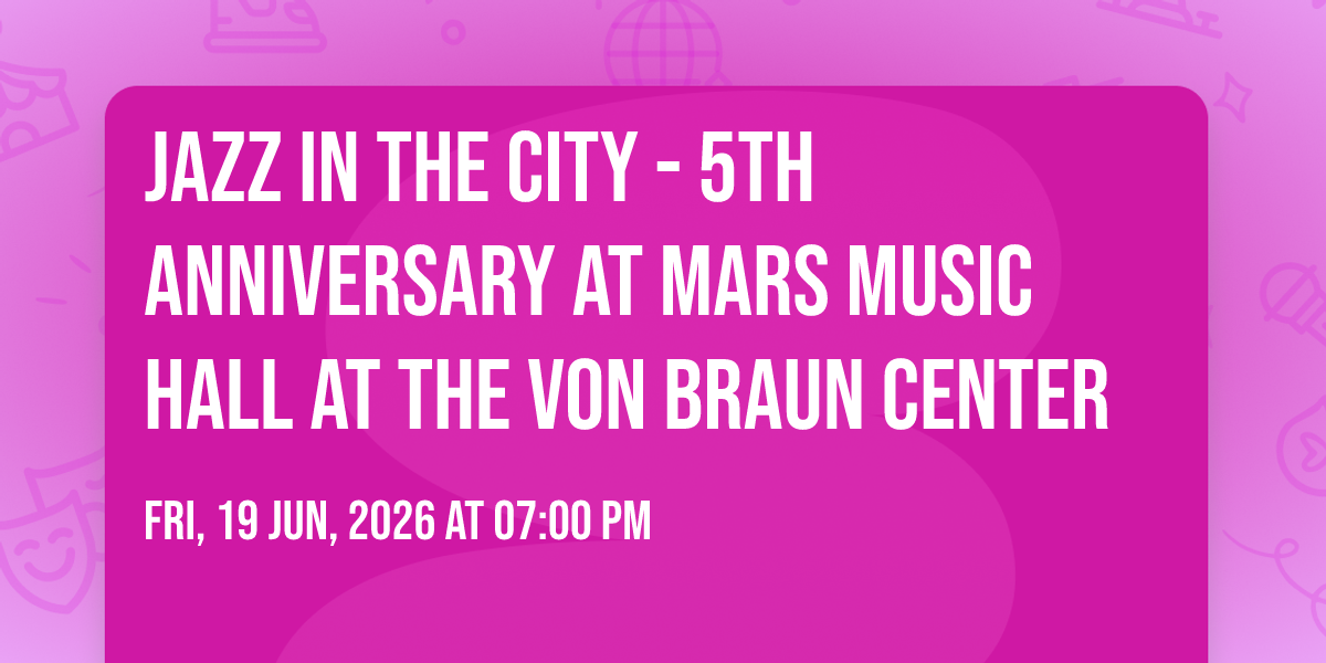 ✨ Discover the extraordinary at Jazz in the City - 5th Anniversary at Mars Music Hall at the Von Braun Center, where magic meets reality in ways you've never imagined! 🏛️ Set in Mars Music Hall at the Von Braun Center nestled in bustling Huntsville, AL, this event promises to be a landmark occasion. 📅 Taking place on June 19th, 2026 at 07:00 PM, it's going to create an atmosphere where every moment becomes a cherished memory. 🌟 Immerse yourself in an experience crafted with attention to every detail, designed to surprise and delight at every turn. They have worked tirelessly to ensure this event exceeds all expectations, bringing together elements of entertainment, innovation, and pure joy. 🎊 Don't miss your chance to be part of this remarkable journey!