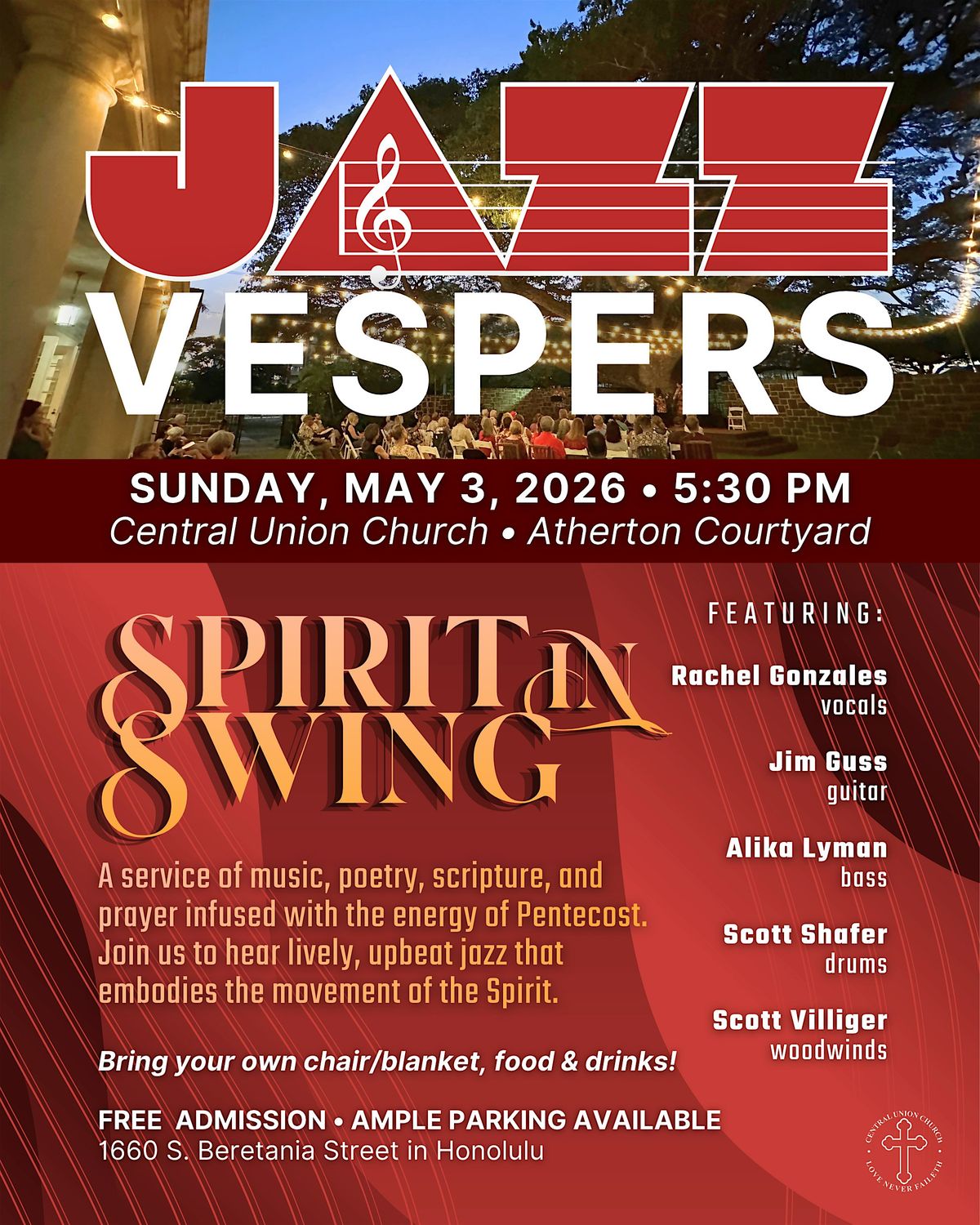 Experience the transformative power of music and spirit at Jazz Vespers. As we approach the Christian celebration of Pentecost, this month's service will be infused with the energy of Pentecost. Join us and hear lively, upbeat jazz that embodies the movement of the Spirit.